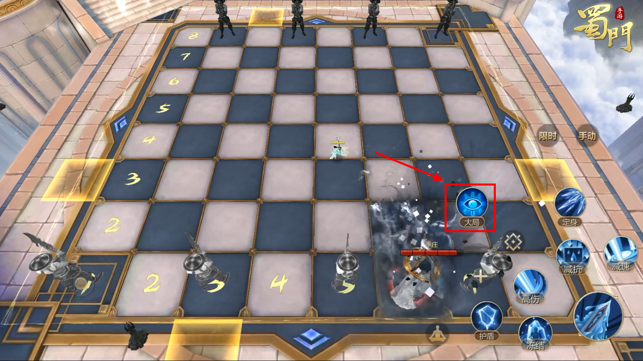 在进入季庄的棋盘之后,在技能栏上方,会出现一个额外的技能【大局】。点击使用该技能,即可切换至俯视全局的视角,可以更清晰的看到整个棋盘。建议大家在不熟悉技能的时候使用大局视角,会更加方便。等熟练了就无需再开启该视角了。