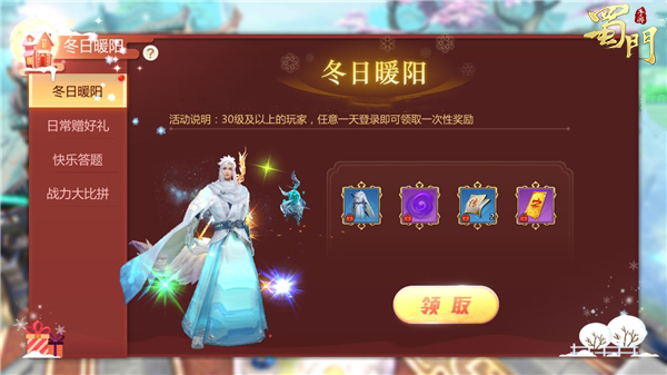 来自蜀门世界的各位蜀友在双十二期间任意一天登录游戏,便可免费获得冬日新装“瀚海丹青”,一袭淡蓝衣着亦不失清逸出尘之色,寒冬之际亦不缺温暖之感,其次蜀友们还可获得一缕妖气、传功符、购物券等奖励。