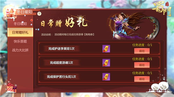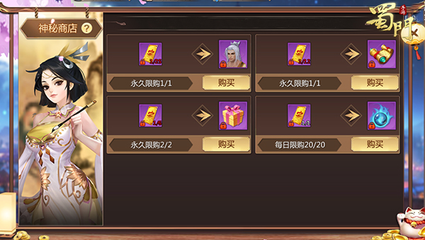 双十二期间神秘商店会再次出现,蜀友们只需通过完成日常任务便可获得购物券,在神秘商店中尽情享受购物的狂欢。蜀友们只需通过护送李英琼、超度游魂、保护苦行头陀、血魔幻境等任务,通关后便可获得一张购物券;完成圣焰战场击杀及助攻20人、乱斗场助攻及击杀20人后,便会获得两张购物券,得到购物券就可在神秘商店中进行购物。