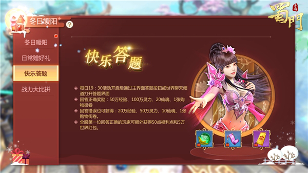 各位蜀友在双十二期间进入游戏,可通过主界面答题按钮或世界聊天频道打开世界答题界面,回答正确的玩家将会获得50万经验、100万灵力、20点仙魂及一张购物券,而回答错误的玩家也会获得20万经验、50万灵力、10点仙魂及一张购物券,全服第一位回答正确的玩家可额外获得50点福利点及5万世界红包。