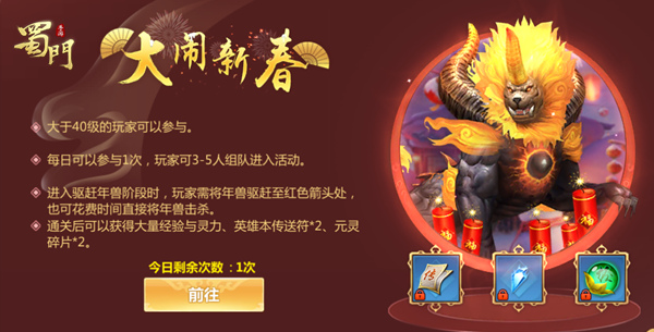 年兽是民间神话传说中的恶兽,每年年关的时候都要出来伤人,寻常之物都拿他没办法,只有鞭炮是年兽唯一畏惧的东西。在《蜀门手游》的春节庆典中,年兽也在预谋破坏,为了让庆典顺利进行,《蜀门手游》发布召集令召集英勇的蜀友们前来驱赶年兽,成功驱赶年兽即可获得英雄本传送符、元灵碎片等福利!