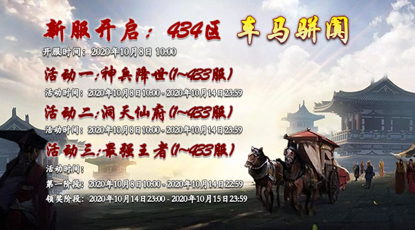 新服开启:10月8日,周四上午10点开新区434区:车马骈阗。 欢迎新玩家入驻!