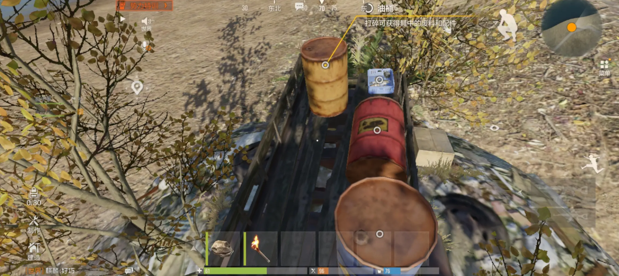 如果是陆地的开局节,开局后别闲着,一定要跑起来,一路跑,一边用最原始的方式捡树、敲石头、拆油桶。红点树能高效产出木材,去闪光矿石点刷石头更效率。优先做石斧和石镐提升采集效率,做木矛则能更快更稳刨桶。