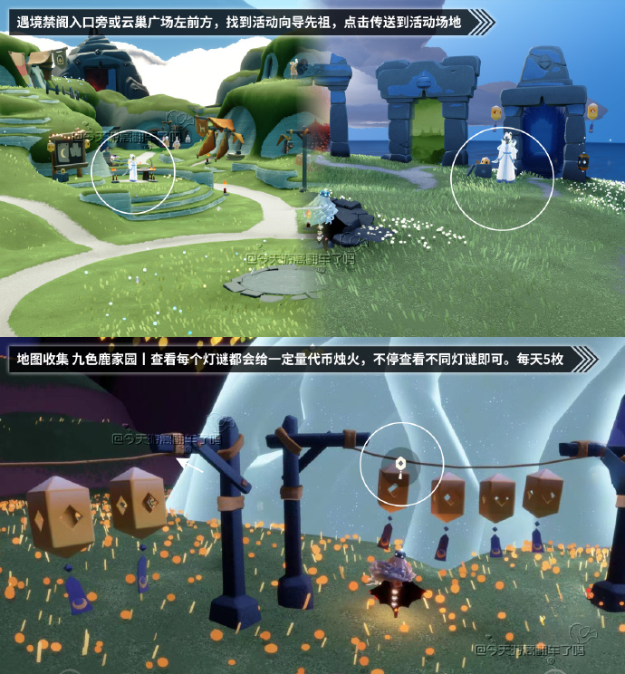 在云巢活动公告板/遇境禁阁入口旁找先祖,可直接前往活动地图