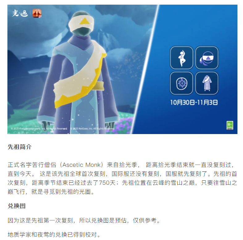光遇国服本周复刻先祖是拾光季盲僧!没想到是他,这个先祖人气超高,按惯例人气如此高的先祖应该通常在特殊节日才会复刻,盲僧先祖打破了这个规律。一般情况下,新季节先祖首次复刻都是国际服先起头,国服跟随。 ?盲僧先祖再一次打破了这个规律!