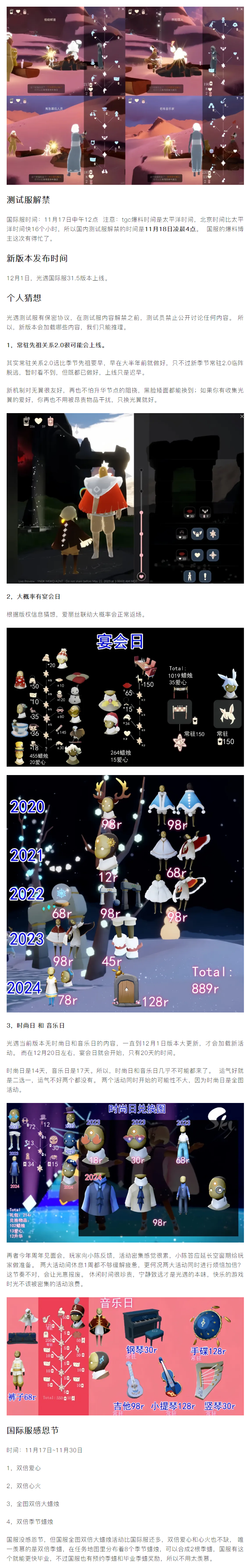 11月果然不平凡,渠道服在渡劫,熬过去就续约,熬不过可能会爆发停服潮。 ?同时,集体回归时间确定了也在11月, 这下有得肝了。 ?还有测试服解禁和新版本,消息来自光遇TGC官方公告。