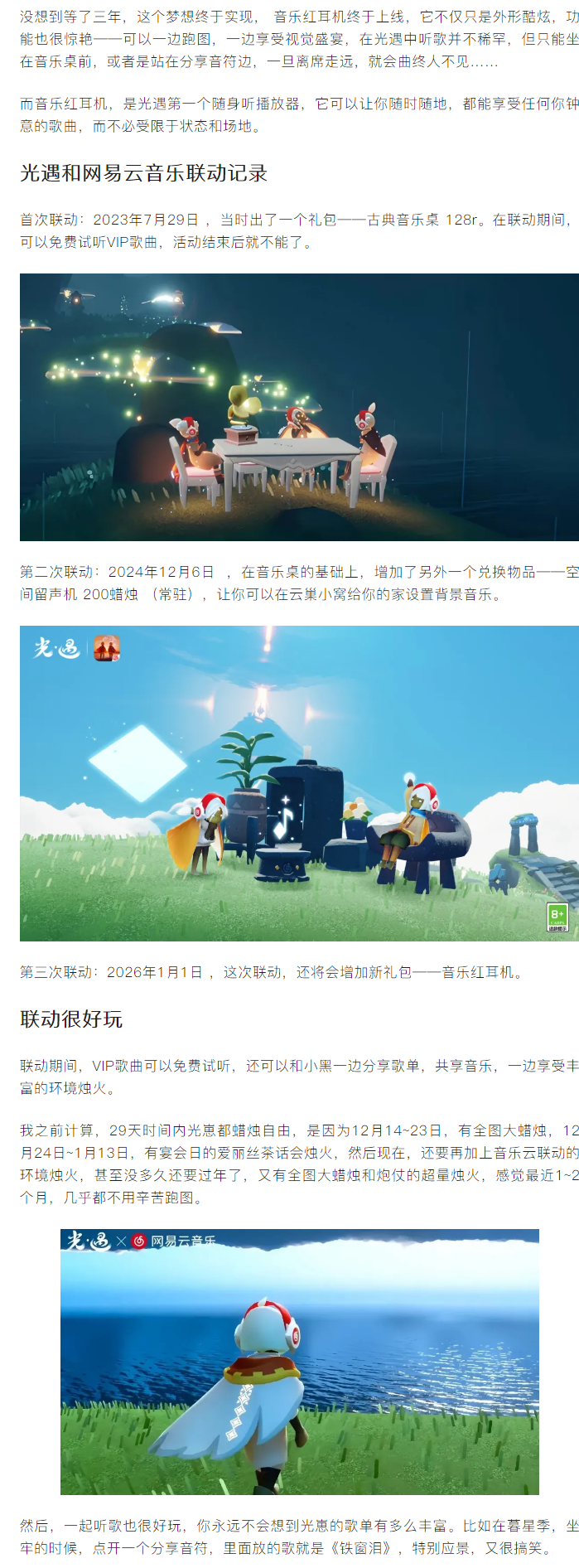 光遇官博刚刚宣布,在2026年1月1日,将会和网易云音乐再次联动,这已经是第三次联动,每次联动都有新物品,这次联动也不例外,它将会带来一个酷炫的新礼包——内置了随身听功能的红耳机!