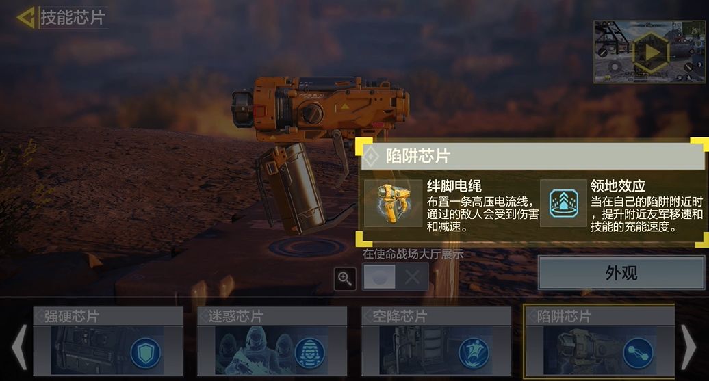 陷阱芯片顾名思义,在使用后能够在场地上放置一个陷阱。主动使用陷阱芯片后,地上将会出现两根柱子,柱子之间则会产生敌人不可见的电流,如果敌人经过柱子之间就会受到持续性的电流伤害并造成减速。而陷阱芯片的被动是可以使在陷阱附近的友方单位获得移动速度和充能速度的提升,有一定的战术作用。