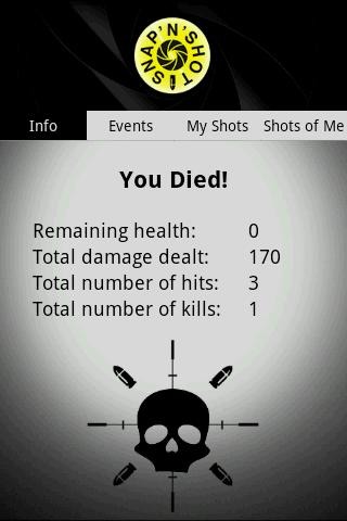 SNAP'N'SHOT is an application/game that transforms your cell phone (at this point only Android platform is supported) in a weapon that is used to shoot other players in a game. You take a picture/shot, select a part of the body that is hit and a person that is in the picture. Info about the shot is delivered immediately to the person in the picture and "health" of that person is reduced. The game is over when one player is left in the game.In short, imagine playing paintball without pain, paint, and payin'.