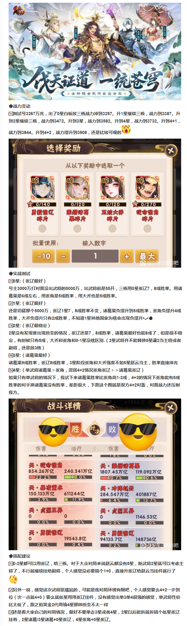 测试号3267万兆,出了0星白板放三核战力掉到3257。升1星继续三核,战力到3387。升到2星继续三核,战力到3472。升到3星,战力到3582。升到4星,战力到3732。升到4+1,战力到3844。升到4+2,战力提升到3908,还是比较可观的