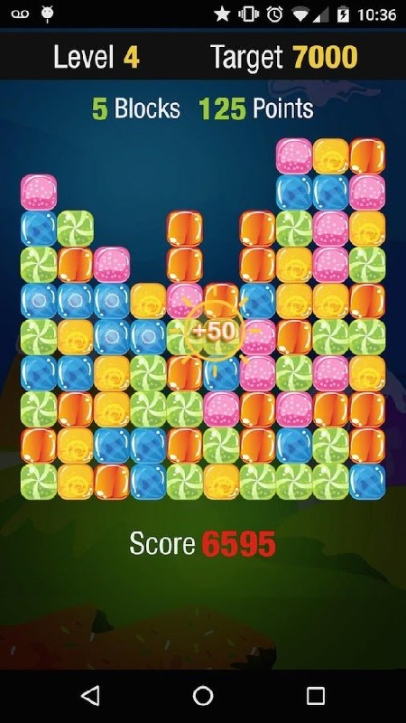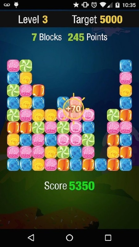 Sweet Candy 2The goal of this game is to get as many as scores by touching the same color candies.Every level has a target score, unlimited levels.Simple and addictive gameplay everyone knows and lovesInstructionThe player needs to tap at least 2 same color candies to get the score. 2 color candies - 20 points3 color candies - 45 points4 color candies - 80 points5 color candies - 125 points6 color candies - 180 points7 color candies - 245 points8 color candies - 320 pointsOnce the player taps 5 or more same color candies, bonus points will be given.Remaining candies bonusThe player will get the bonus points if there is less than 20 candies left. The player will get 50 points for a candy.Hope you enjoy playing Sweet Candy 2 and try to get the score as high as possible.