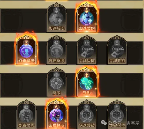 第1行点元素鼓舞加成伤害(推图有难度的时候可以选择元素庇佑,遇到特定反弹伤害时候可以选择消音护甲)