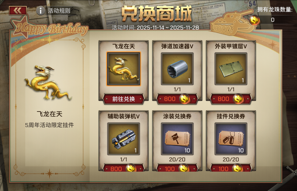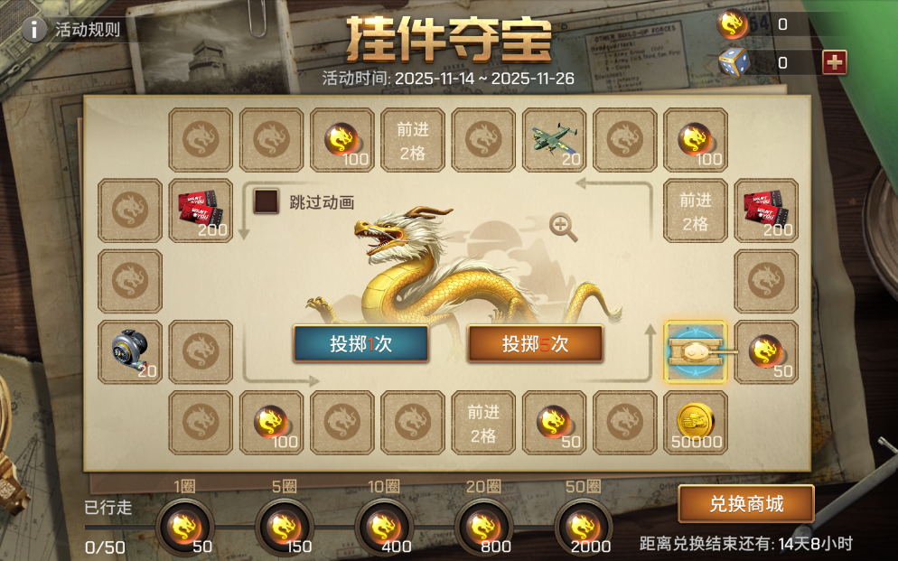 龙战于野,其血玄黄。五载烽火,铸就传奇。为此,我们精心打造了五周年限定挂件——「飞龙在天」。愿这份桀骜不屈的龙之战魂,与每一位指挥官同在,助您在未来的每一场战斗中,破阵摧坚,所向披靡!在游戏活动期间,指挥官们可以使用骰子进行投掷,单次可选择投掷1次或5次,每次投掷将随机获取1~6的前进步数。坦克将根据投掷点数向前移动相应的步数并停下。如果坦克停在的格子包含奖励,指挥官可以立即获取该奖励。