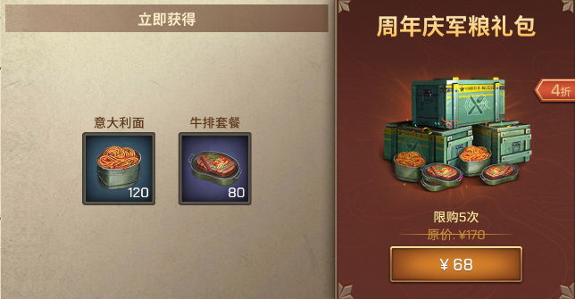 68元周年庆军粮礼包: 意大利面*120,牛排套餐*80