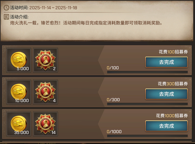 炮火洗礼一载,锋芒愈烈!活动期间每日完成指定消耗数量即可领取消耗奖励。