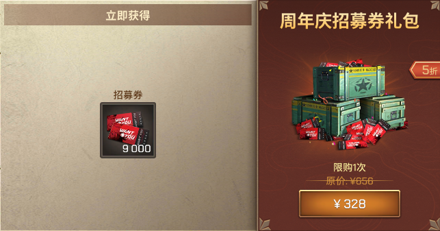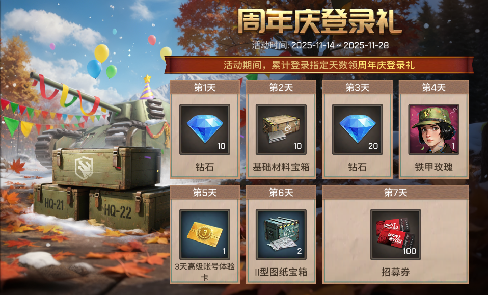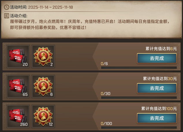 履带碾过岁月,炮火点燃周年!庆周年,充值特惠已开启!活动期间每日充值指定金额,即可获得额外招募券奖励,优惠不容错过!