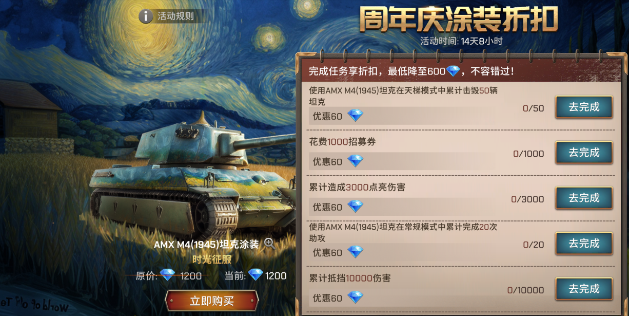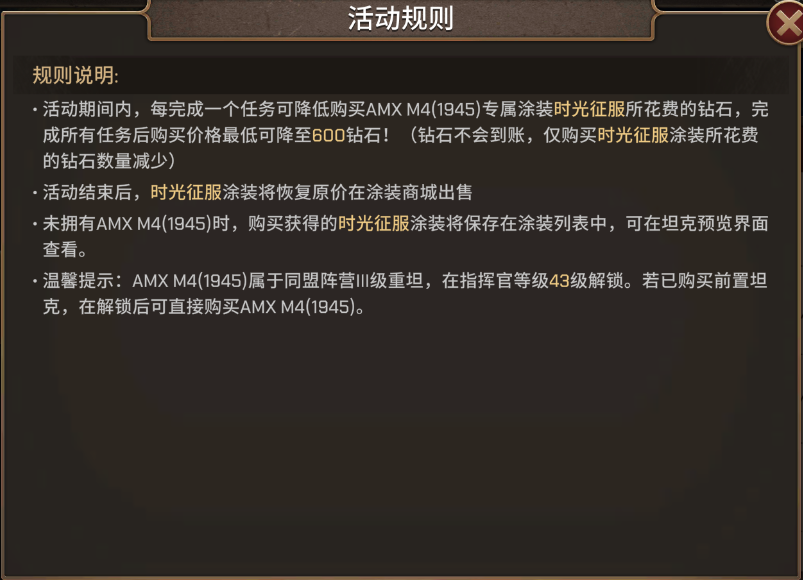 活动期间内,每完成一个任务可降低购买【时光征服】所花费的钻石,完成所有任务后购买价格最低可降至600钻石!活动结束后,涂装将恢复原价在涂装商城出售。(请注意,钻石不会到账,仅为减少购买涂装所需花费的钻石)