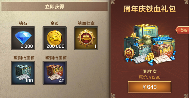 648元周年庆铁血礼包:钻石*2000,金币*200000,铁血勋章*1,II型图纸宝箱*100,III型图纸宝箱*40