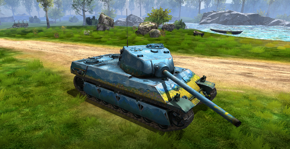 它的炮塔与车身以蓝调为底,酷似梵高的星空画作,正面有大块的黄色麦田设计,背靠巍峨青山,还有彩色鲜花做点缀,像一件精美的艺术品。长炮管带有色彩渐变,履带裹挟着金属的粗粝质感,装甲上的斑驳不仅是涂装的做旧,更像一段段被战火打磨的记忆,复古迷彩下,是机械与艺术碰撞出的铁血浪漫。