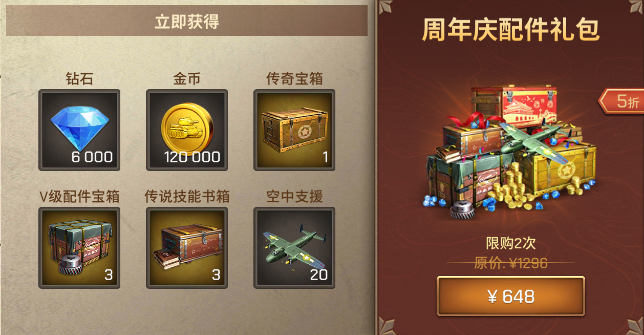 648元周年庆配件礼包: 钻石*6000,金币*120000,传奇宝箱*1,V级配件宝箱*3,传说技能书箱*3,空中支援*20