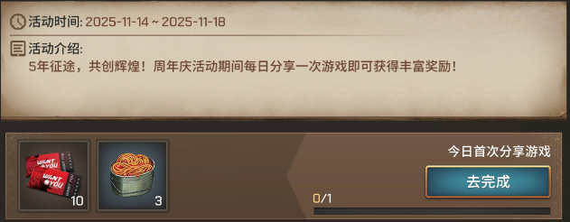 5年征途,共创辉煌!周年庆活动期间每日分享一次游戏即可获得丰富奖励!每日分享1次游戏,领取[招募券]*10,[意大利面]*3