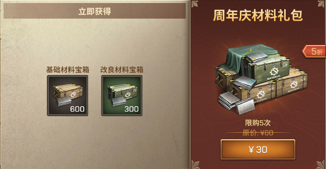 30元周年庆材料礼包:基础材料宝箱*600,改良材料宝箱*300