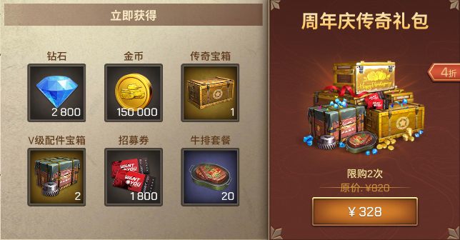 328元周年庆传奇礼包: 钻石*2800,金币*150000,传奇宝箱*1,V级配件宝箱*2,招募券*1800,牛排套餐*20