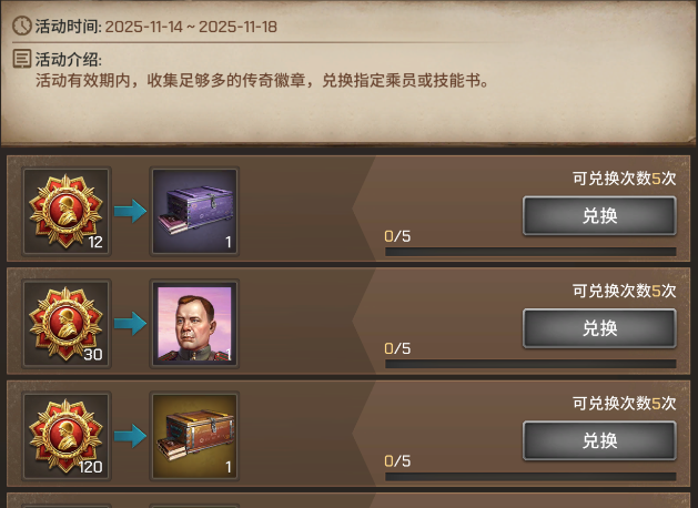 活动有效期内,收集足够多的传奇徽章,兑换指定乘员或技能书。