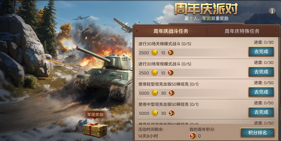 庆典期间,参与欢乐战斗派对,完成各类战斗任务和特殊任务集积分赢好礼。在派对中,每个人都能参与并贡献,与战友们合同协作,累积周年积分,领取个人和军团双重奖励。活动期间,完成战斗任务和特殊任务即可获得对应奖励和积分,系统将根据玩家积分进行全服排名,全服前200名玩家可获得海量招募券奖励,排名越靠前,获得的数量越多。