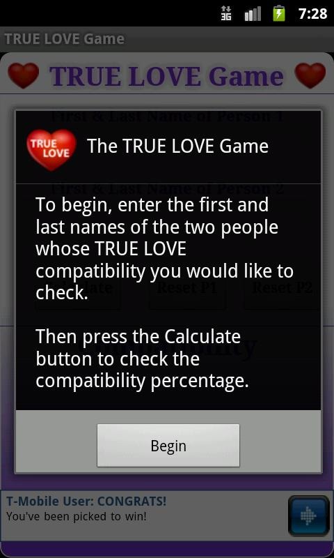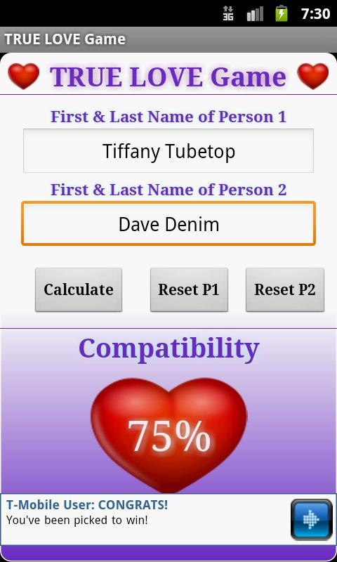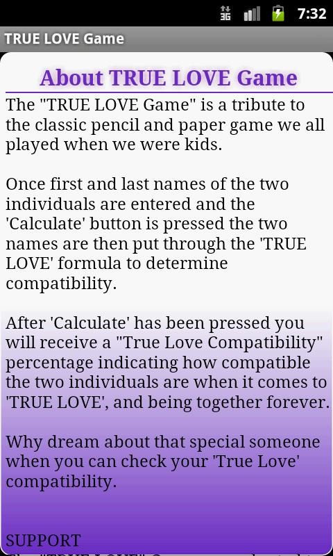 A tribute to the classic pencil and paper game we all played when we were kids. Enter a first and last name for two individuals and check just how compatible the two might be when it comes to "TRUE LOVE" and being together forever.Why dream about that special someone when you can check your 'TRUE LOVE' compatibility and know what the future may hold.The permissions are in place for providing location based ads, offers and other apps.