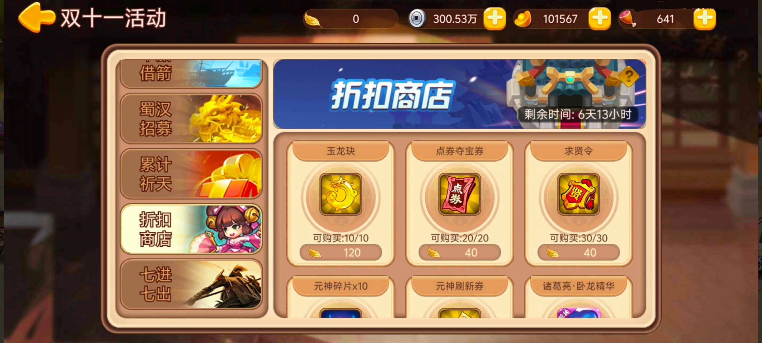 累计充值108元:特殊材料自选*1、金叶子*120、诸葛果元神*1