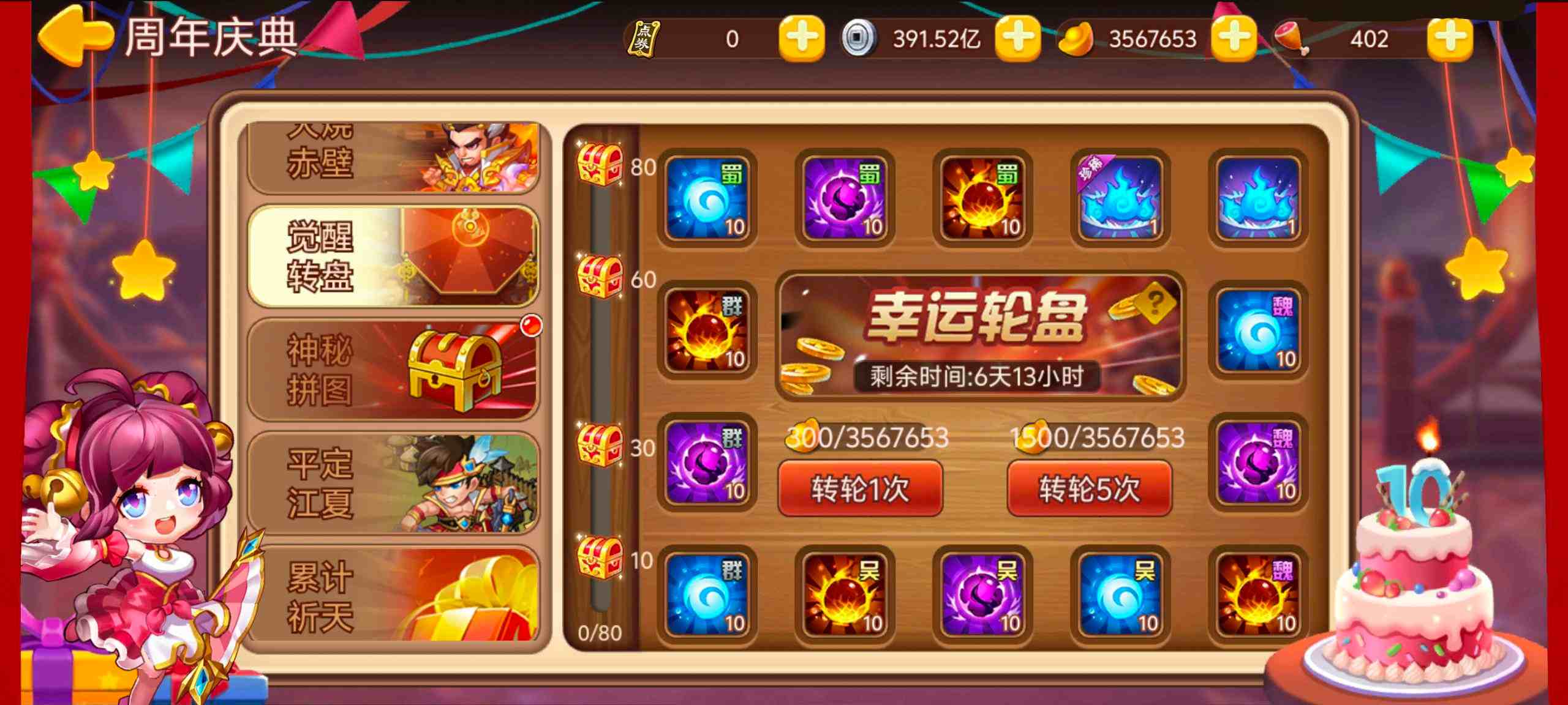 活动奖励:庆典券、元宝、求贤令、精华刷新券、随机元神、节日惊喜宝箱、周年福袋等。