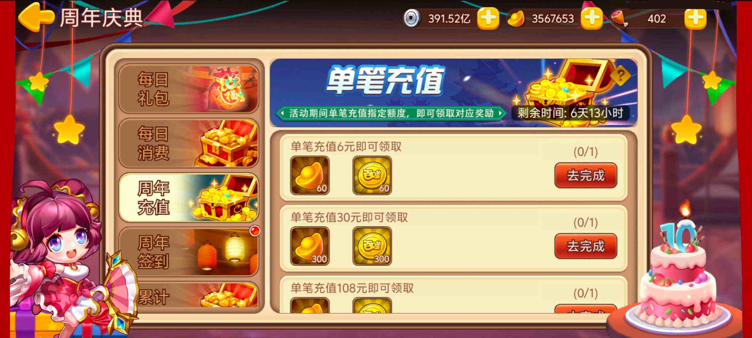 单笔充值6元:元宝*60,周年金币*60
