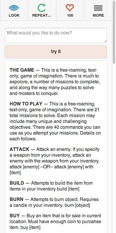 txtGame is a free-roaming, text-only, game of imagination.You are the main character. Your goal is to help all the kids throughout the game and complete the mission for each. Along the way there is much to explore, lots of mosters to conquer, and many, many puzzles to solve.But be warned...this game is not easy. There is no official manual. There are no graphics. You will often have to think outside of the box.Can you solve every puzzle? Will you discover every spot on the map? Can you acquire and unlock the secrets of every skill, item, and spell? Will you find a way to complete every mission? Is your imagination big enough, your patience long enough, and your desire great enough to handle it all?Play txtGame and find out!