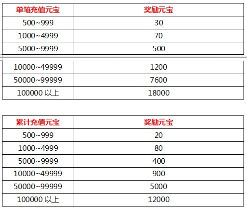 活动内容:每日单笔充值和累计充值的元宝达到一定数额即可获得对应数额的元宝返还,详情如下