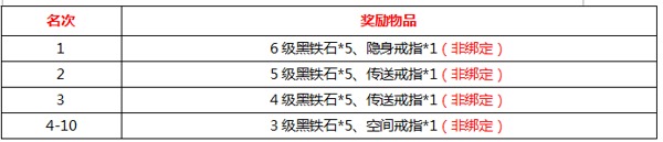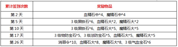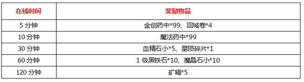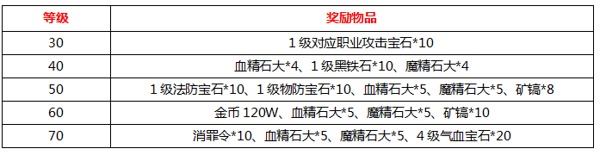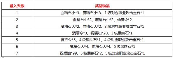 活动奖励:宝石礼盒、血精石中、魔精石中、消罪令、1W金币卡、黑铁石宝盒、复活令、祝福油