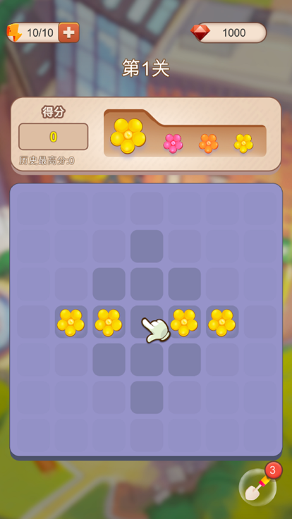 外婆的花园有很多颜色的花朵,花朵连到一起,只有横竖达到3个或者以上即可 [详情]