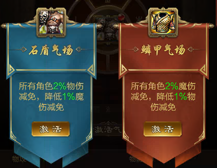 石盾气场:所有角色提升物伤减免,降低魔伤减免