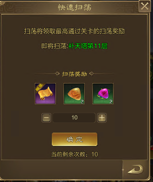 每日还可额外获得10次扫荡机会,根据挑战的最高层数可以直接扫荡获得专属扫荡奖励。