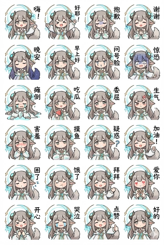 为我生成图中角色的绘制Q版的,LINE风格的半身像表情包,注意头饰要正确