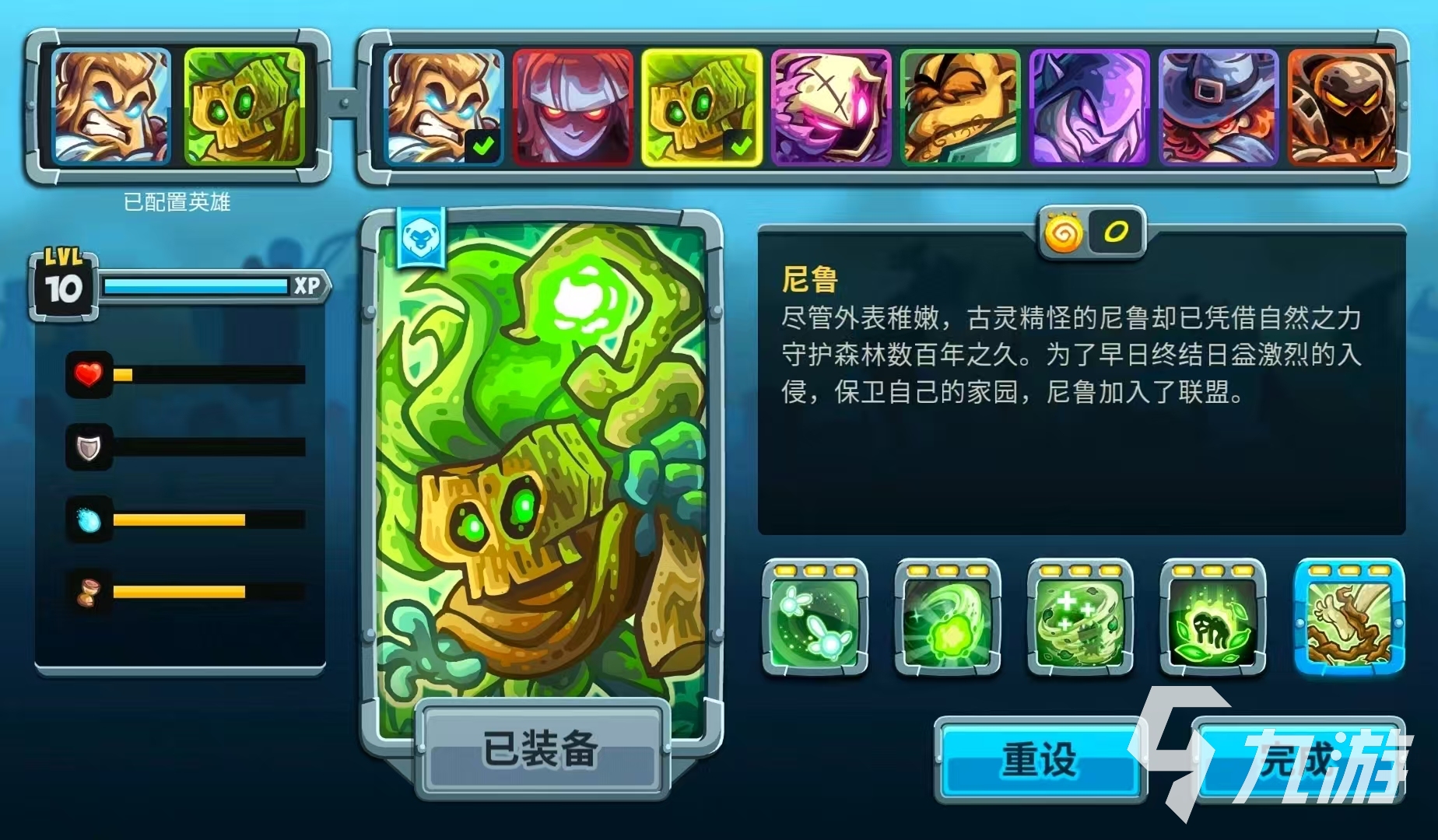 尼鲁的外表比较稚嫩,但是自身作为森林守护者,已经凭借自然之力守护森林数百年,为了对付日益增多的入侵者对家乡的威胁,所以加入到了联盟中。玩家通过第4关之后就可以解锁尼鲁。尼鲁主要技能包括哨兵仙灵、翠绿迸发、叶片旋风、衰弱咒语、根系守卫等。哨兵仙灵可以召唤出友善仙灵,跟随并造成魔法伤害。翠绿迸发能发射出绿色能量,造成魔法伤害。