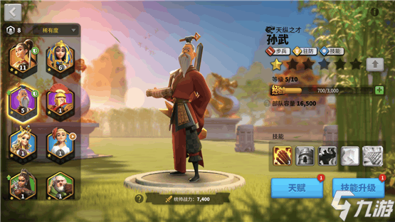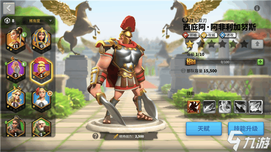 英雄有擅长的天赋,例如埃及艳后克丽奥佩特拉七世最拿手综合、采集、辅助。阿非利加努斯则擅长领袖、攻城、进攻。