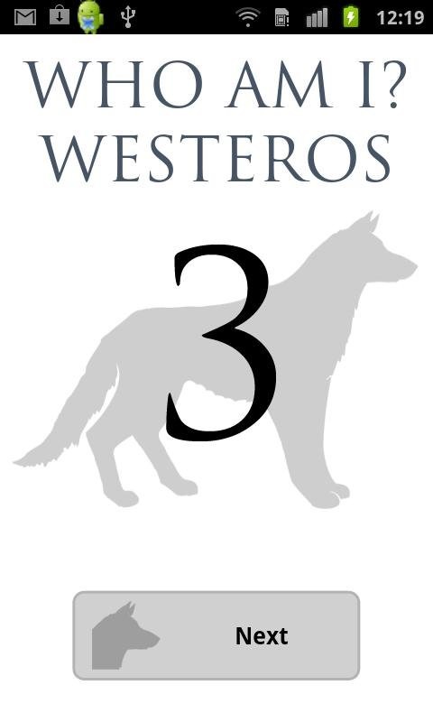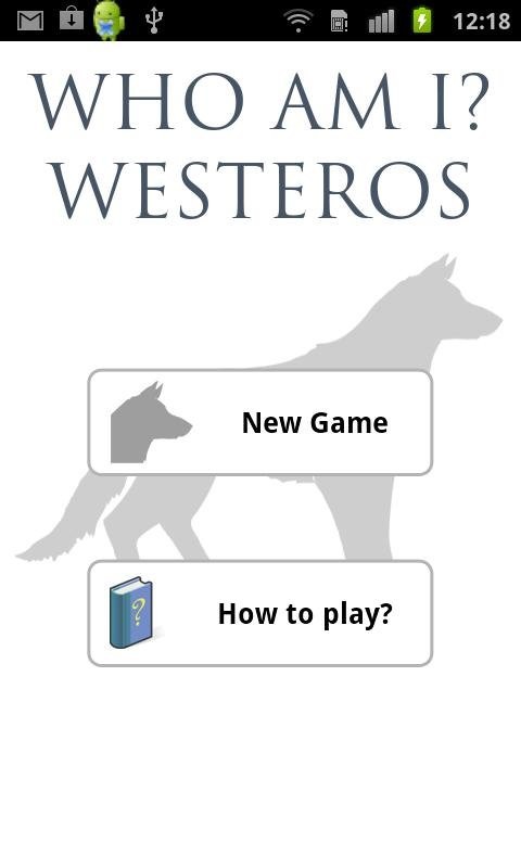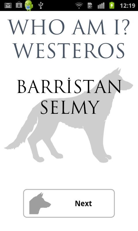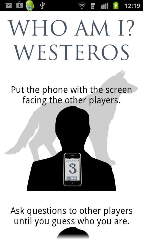 Game based on the great saga Song of Ice and Fire by George RR Martin (Game of Thrones TV Serie).Each time one player take the phone and show the name of a Westeros character without see the screen. The player must ask questions until guess the name.