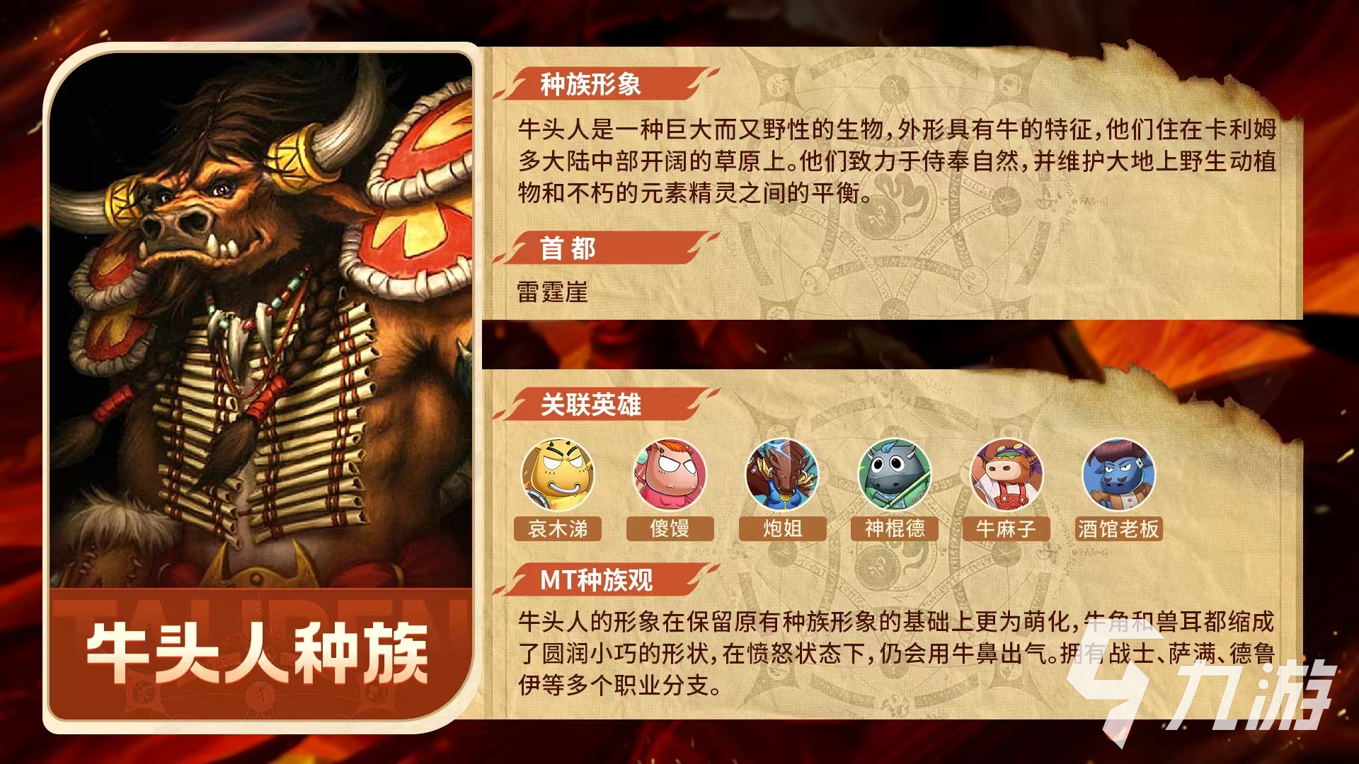牛头人种族致力于侍奉自然,在维护大地上野生动植物和不朽的元素之灵之间找到平衡,他们的首都是雷霆崖。游戏中的牛头人形象保留了原有的种族形象,进行了萌化设定,牛角和兽耳都变成了圆润小巧的形状,在愤怒状态下依然会用牛鼻出气。牛头人的职业比较丰富,包括战士、萨满、德鲁伊等,拥有多个职业分支。关联英雄主要包括哀木涕、傻馒、炮姐、神棍德,牛麻子和酒馆老板。