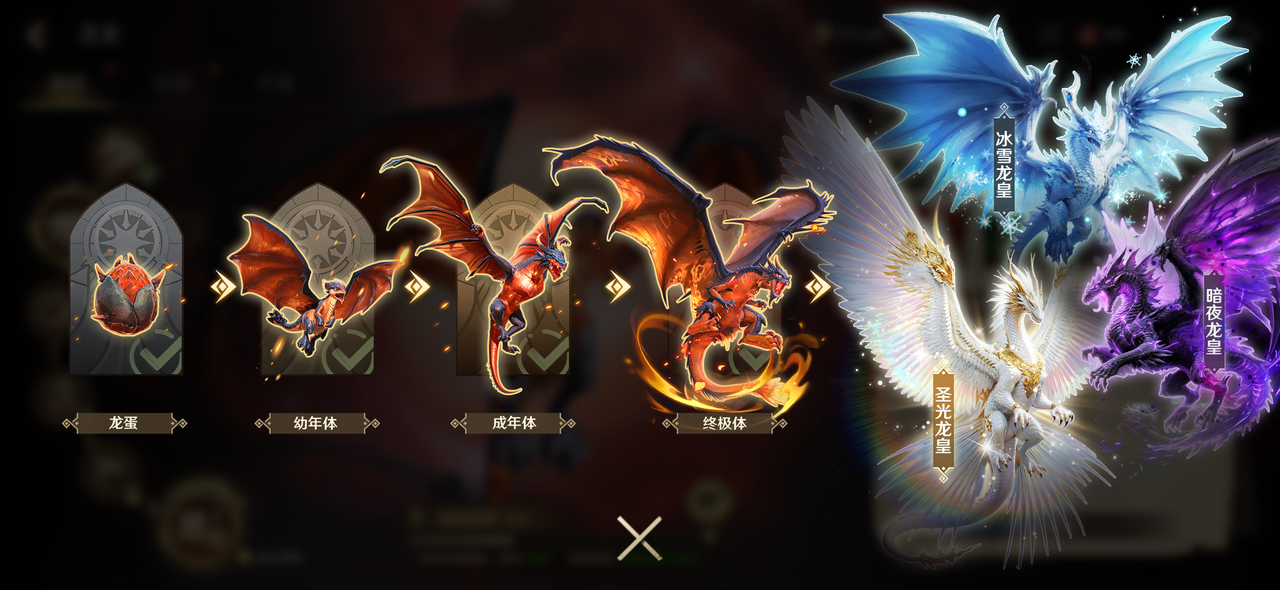 这次同步解锁三大龙皇分支:圣光龙皇:圣洁羽翼裹着鎏金纹路;冰雪龙皇:冰蓝鳞羽缀满霜雪特效;暗夜龙皇:紫焰暗纹自带神秘buff!