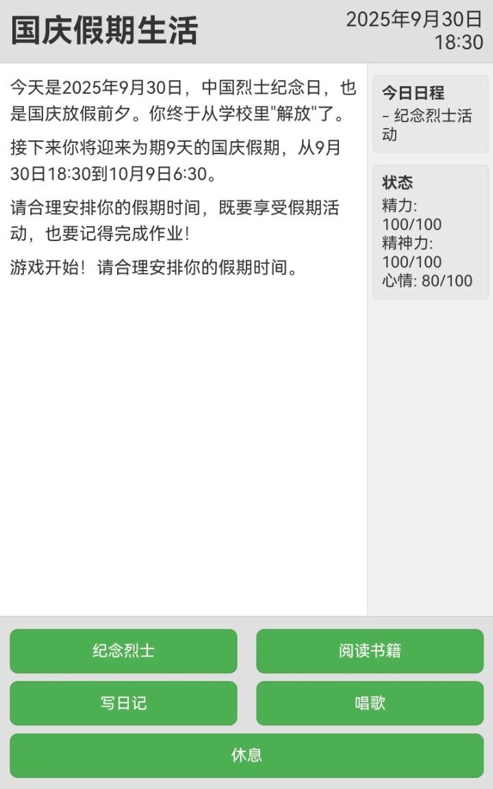 《未完成的作业:国庆》是一款充满乐趣与休闲氛围的文字游戏。游戏设定在一个国庆和中秋的假期,玩家扮演一名学生,在游戏中度过有意义的八天假期。玩家需要在八天时间内,选择参与各种活动或者选择休息,来推进游戏进程。在这个过程中,玩家需要消耗精神力来参加活动,并通过休息来恢复体力并继续活动。游戏的结尾,玩家还可以看到假期的评级(R~SSS)。玩家可以努力达成最佳结局,也可能因为各种情况走向不同的结局。此外,游戏中还设置了多个特殊活动,当满足特定条件时就可以参与,为游戏增添了更多探索乐趣。