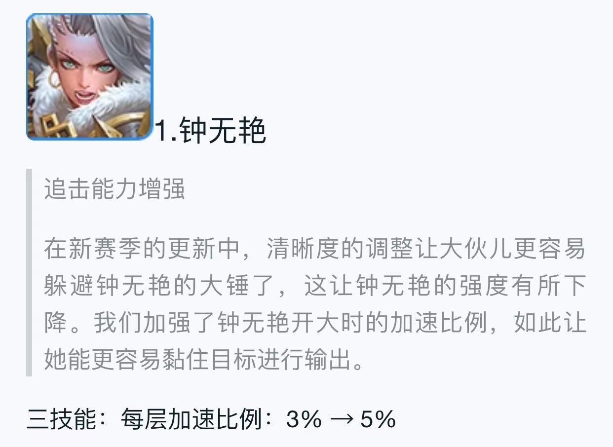 王者荣耀在4月20号对钟无艳进行了技能调整,召唤师想知道钟无艳有哪些变化,调整以后该怎么玩,下面就来分享王者荣耀4.20钟无艳调整后怎么玩。 一、调整的具体内...[详情]