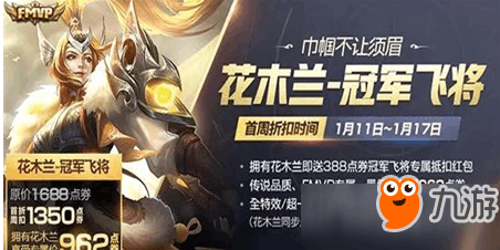 《王者荣耀》游戏即将于1月11日上新全新皮肤“花木兰冠军飞将皮肤”。这款皮肤首周购买将会降低几百个点券。“花木兰冠军飞将皮肤”售价详情以及专...[详情]