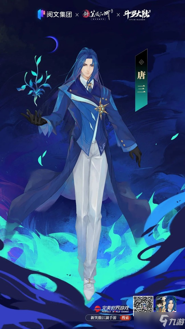 唐三眼眸深邃,身形伟岸,肩膀宽阔。一头一直垂到脚下的水蓝色长发,常穿着华贵的蓝色长袍。他来自斗罗大陆,拥有蓝银皇与昊天锤双生武魂,封号“千手斗罗”。