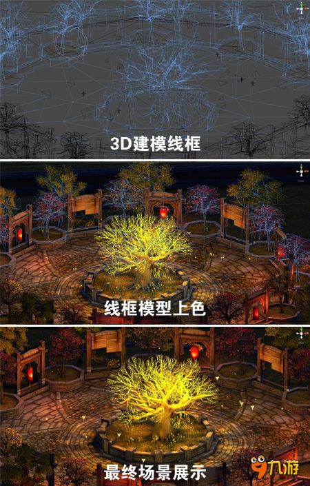 而在《苍穹之剑》中,无论是人物还是场景,全部采用3D建模。下图展示的就是游戏中著名场景“姻缘木”。从3D线框图对比最终实景可以发现,小到一截树枝,大到整个场景,都是由密密麻麻的3D模型组合构成。置身于这种全3D场景,给予玩家的拟真感,自然不是“假3D”场景能够相提并论的。